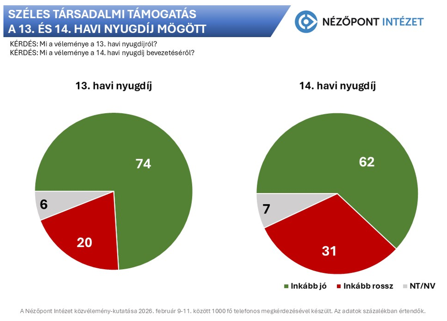 A 13. és 14. havi nyugdíjról a teljes felnőtt népesség nagy többsége van jó véleménnyel (74 és 62 százalék) és mindössze 20, illetve 31 százalék a nem támogatók aránya. 6 valamint 7 százalék pedig nem tudott vagy akart válaszolni a kérdésben.