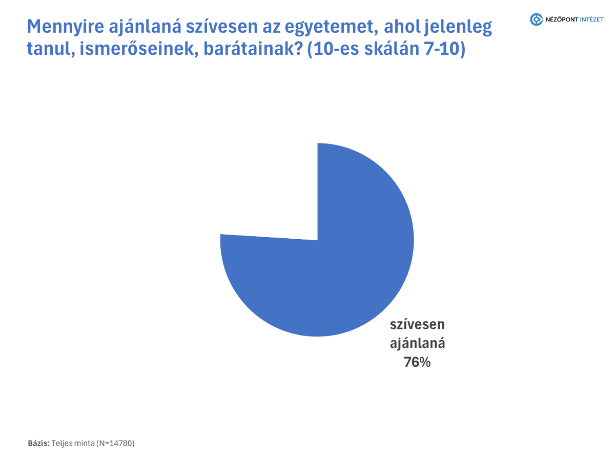 A hallgatói elégedettség egyik legerősebb mutatója az ajánlási hajlandóság. A kutatás szerint a diákok háromnegyede (76 százalék) szívesen ajánlaná barátainak és ismerőseinek az egyetemét. Ez a mutató kiemelkedően fontos, hiszen a személyes tapasztalat a legmeggyőzőbb érv: a továbbtanulás előtt álló fiatalok döntéseit sokszor az idősebb hallgatók és friss diplomások véleménye befolyásolja.