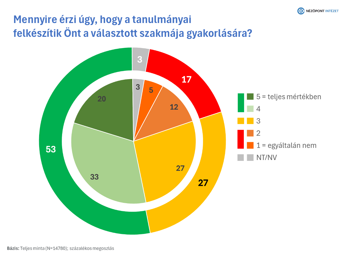 Figyelemre méltó még, hogy a hallgatók több, mint fele (53%) úgy érzi, tanulmányai valóban felkészítik a választott szakmája gyakorlására. Ez azt mutatja, hogy az egyetemek képzései a diákok szemében nem pusztán elméleti tudást adnak, hanem olyan gyakorlati kompetenciákat is, amelyek a munkaerőpiacon közvetlenül hasznosíthatók. A diplomások munkaerőpiaci sikeressége szempontjából ez kulcstényező: ha a hallgatók úgy érzik, hogy az egyetemen megszerzett tudásuk hasznosítható, az közvetlenül növeli az intézmények hitelességét és vonzerejét is
