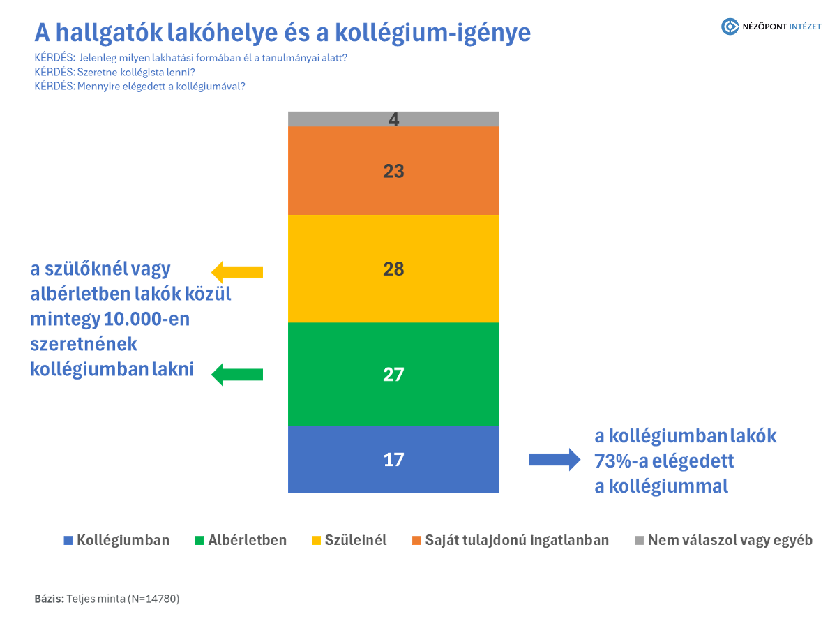 A hallgatói életminőség szempontjából a lakhatás az egyik legfontosabb tényező. A kutatás szerint a diákok jelentős része jelenleg szülőknél vagy albérletben él, miközben mintegy 10 000 hallgató jelezte: szívesen költözne kollégiumba. Ez világos jelzés arra, hogy a felsőoktatási infrastruktúra bővítésében a kollégiumok fejlesztése kiemelt szerepet kell kapjon. Pozitívum ugyanakkor, hogy a kollégiumban lakók közel háromnegyede (73 százalék) elégedett a körülményekkel, ami azt mutatja, hogy ahol a szolgáltatás elérhető, ott megfelelő minőséget nyújt.