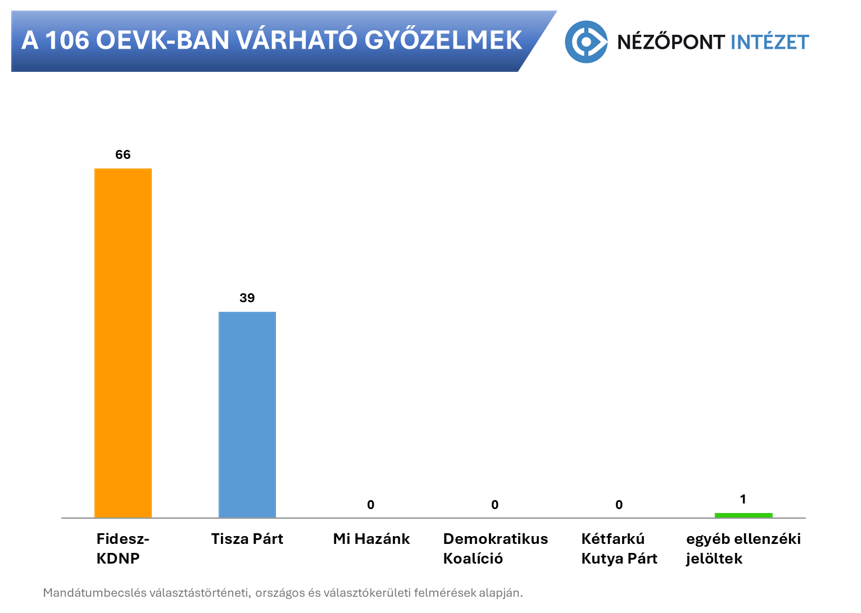 A fennmaradó 35 választókerületből 22-ben nagy valószínűséggel állítható, hogy a kormánypártok jelöltje fog győzni, míg 13-ben várhatóan a tiszás kihívóik végeznek az első helyen. Összességében tehát a Fidesz-KDNP 66, a Tisza Párt 39 választókerületben bízhat a jelöltjei győzelmében, további egy választókerületben pedig más, Tisza-közeli ellenzéki jelölt kerülhet az első helyre. A Mi Hazánk, a DK, a Kétfarkú Kutyapárt jelöltjei vagy az említetten túl más független induló megválasztása az egyéni választókerületekben irreálisnak tűnik.