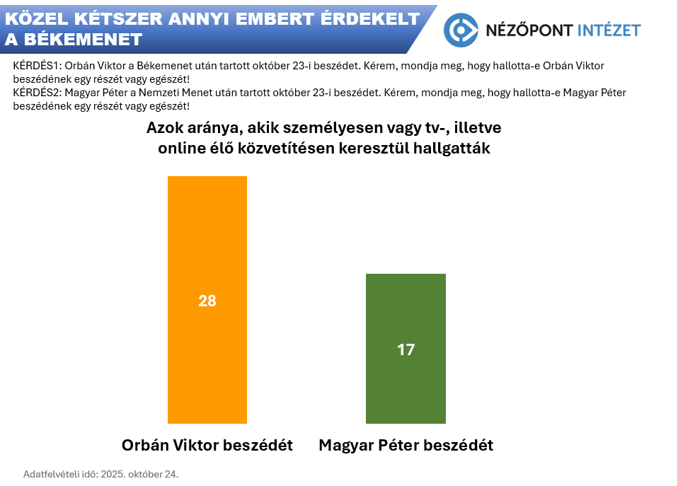 A felnőtt magyarok 28 százaléka hallgatta meg Orbán Viktor október 23-ai beszédének „egy részét vagy egészét”, személyesen vagy tv-, illetve online élő közvetítésen keresztül.