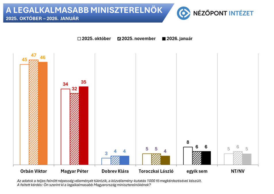 Az országgyűlési választás politikai értelemben miniszterelnök-választás is. A választópolgárok jogi értelemben ugyan pártlistákat és választókerületi képviselőket támogatnak, valójában arról is döntenek, ki legyen Magyarország kormányfője. Hetven nappal a választás előtt azonban úgy tűnik, Magyar Péter hátránya a miniszterelnöki alkalmassági versenyben behozhatatlan. A Nézőpont Intézet januári kutatásában, négy megnevezett jelölt közül, a választókorú magyarok 46 százaléka nevezte a hivatalban lévő kormányfőt a legalkalmasabbnak, s csak a megkérdezettek 35 százaléka Magyar Pétert, a Tisza Párt vezetőjét. Ez az adat megfelel az októberinek: Orbán Viktor akkor is 11 százalékpontos előnyben volt Magyar Péterhez képest (novemberben az előny, átmenetileg 15 százalékpontra nőtt).