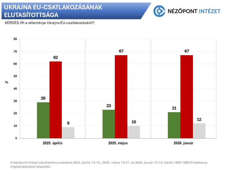 A magyarok 67 százaléka van rossz véleménnyel keleti szomszédunk lehetséges tagságáról az Európai Unióban és mindössze egy ötöd (21 százalék) támogatná azt. A tavalyi évvel összehasonlításban lényeges változás, hogy tovább nyílt az olló a kérdésben, hiszen 2025 áprilisához képest nőtt az elutasítók (62 százalékról 67-re) és egyben jelentősen csökkent a tagságot helyeslők aránya (29 százalékról 21-re). Még ennél is többen ellenzik Ukrajna katonai támogatását, hiszen 21 százaléknyi pozitív vélemény mellett 69 százaléknyian vélekednek negatívan róla.